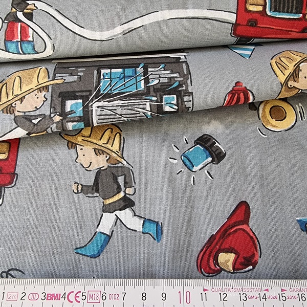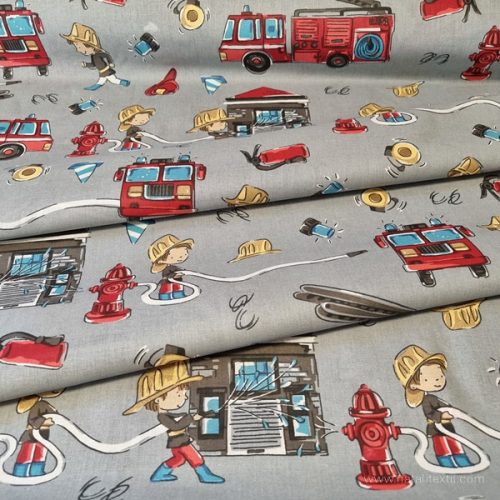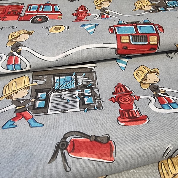 Vidám tűzöltók szürke alapon pamut perkál 150 cm széles (13411-1)